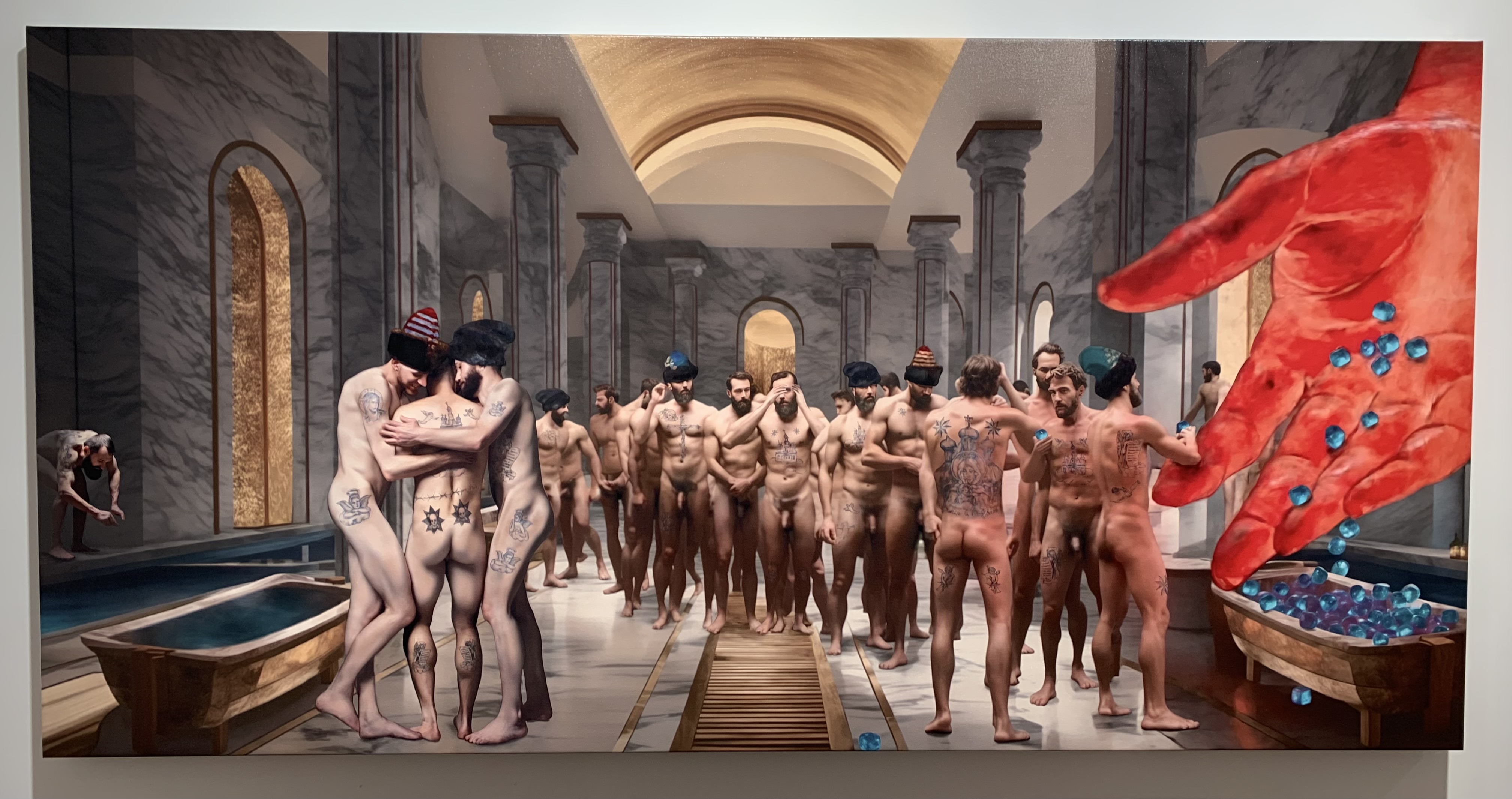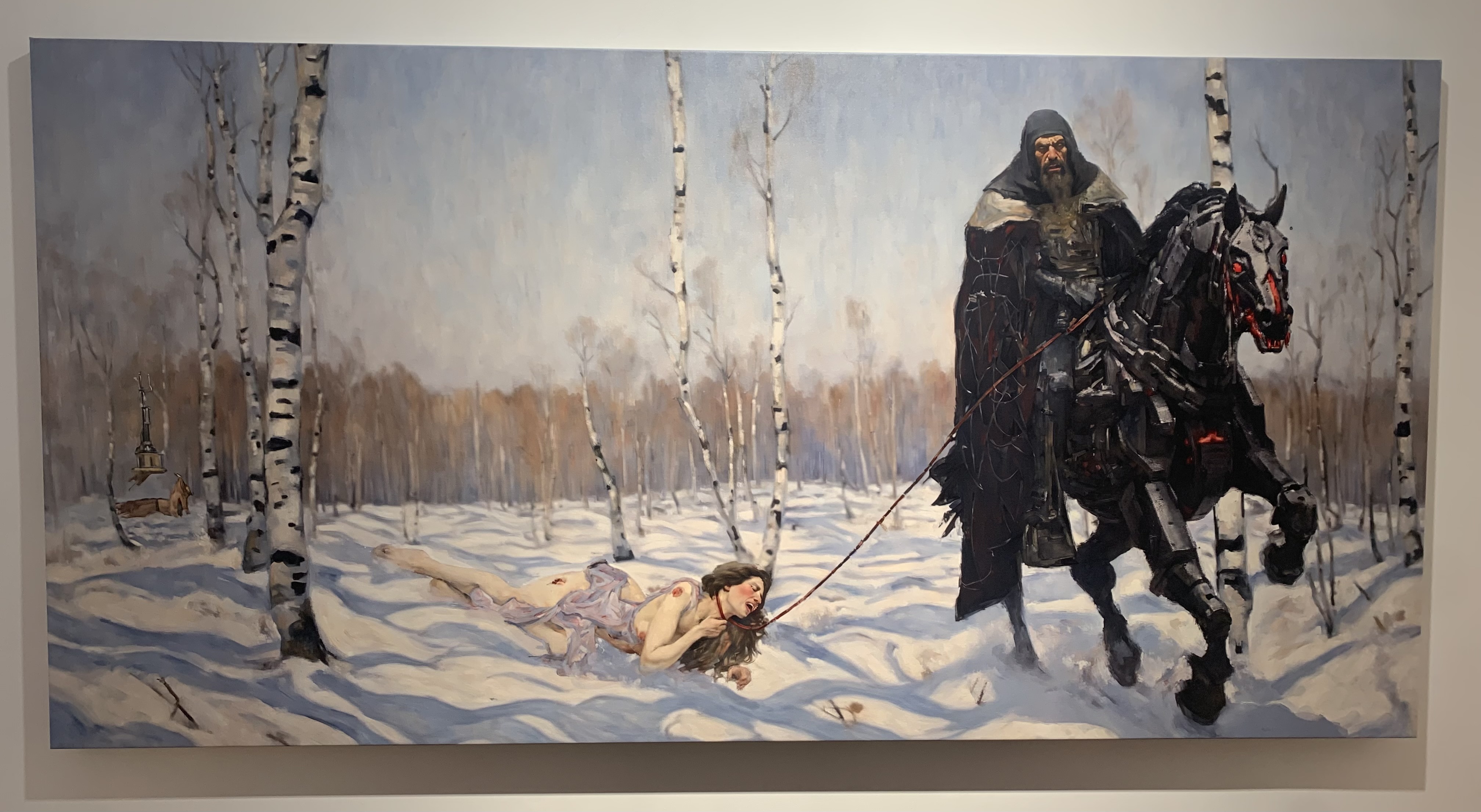 Another AI arwork showcasing the bathhouse orgy. In the book, it ends with oprichniks forming a “caterpillar” chain using their reproductive organs and bums as a ritual of bonding, unity, and pleasure.Both Vladimir Sorokin and Marat Guelman, the exhibition’s curator, described it as an art project or an art installation rather than a series of paintings, which is a fair way to position it. For Sorokin, it was a chance to see his book coming to life, even though the images were always not as he imagined them in his head almost 20 years ago. He said they are not book illustrations and shouldn’t be considered as a part of the story, but a separate project “inspired by” it. Artworks included scenes that were not in the book but could still take place in the world depicted in the story, exploring its extra facets.