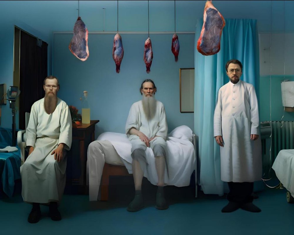 In the book, the blue lard is a substance that is produced by clones of Russian writers and defies the second law of thermodynamics. Sorokin doesn’t just put a dozen of clones of the classic Russian authors into a wild and bizarre setting, he masterfully mimics style of each of them. The book itself is suggested to be written by a clone of Sorokin himself, hence also justifying the perverted depiction of reality in it.Literature in Russia still plays an important role in the society. During his readings and Q&A a few days before the London exhibition, Sorokin said: “Literature in Russia has always overshadowed philosophy and taken its place.” Even those who considered themselves philosophers often attempted to write novels to deliver and distribute their ideas (not always successfully). Russian writers are still looked at and listened to, they are celebrities, public thinkers, and their opinion at least arouses interest—people wait for an explanation of what’s going on, “who’s to blame” and “what’s to be done”, at least in a metaphorical way. The government seem to understand it and sees potential danger and a literal threat in the literary word, thus, at it has been for ages, writers in Russia have been subjected to controversy, censorship, prosecution, oppression, banished, hounded, imprisoned, and killed. The whole culture, as it seems to me, was formed not “thanks to”, but “in spite of” the state, and it remains so. The state didn’t foster culture; the culture, the one that’s remembered, thrived in resistance to it. Thus what Russia really is, or was or will be, can often be seen in literature more than in philosophy or sometimes even history.