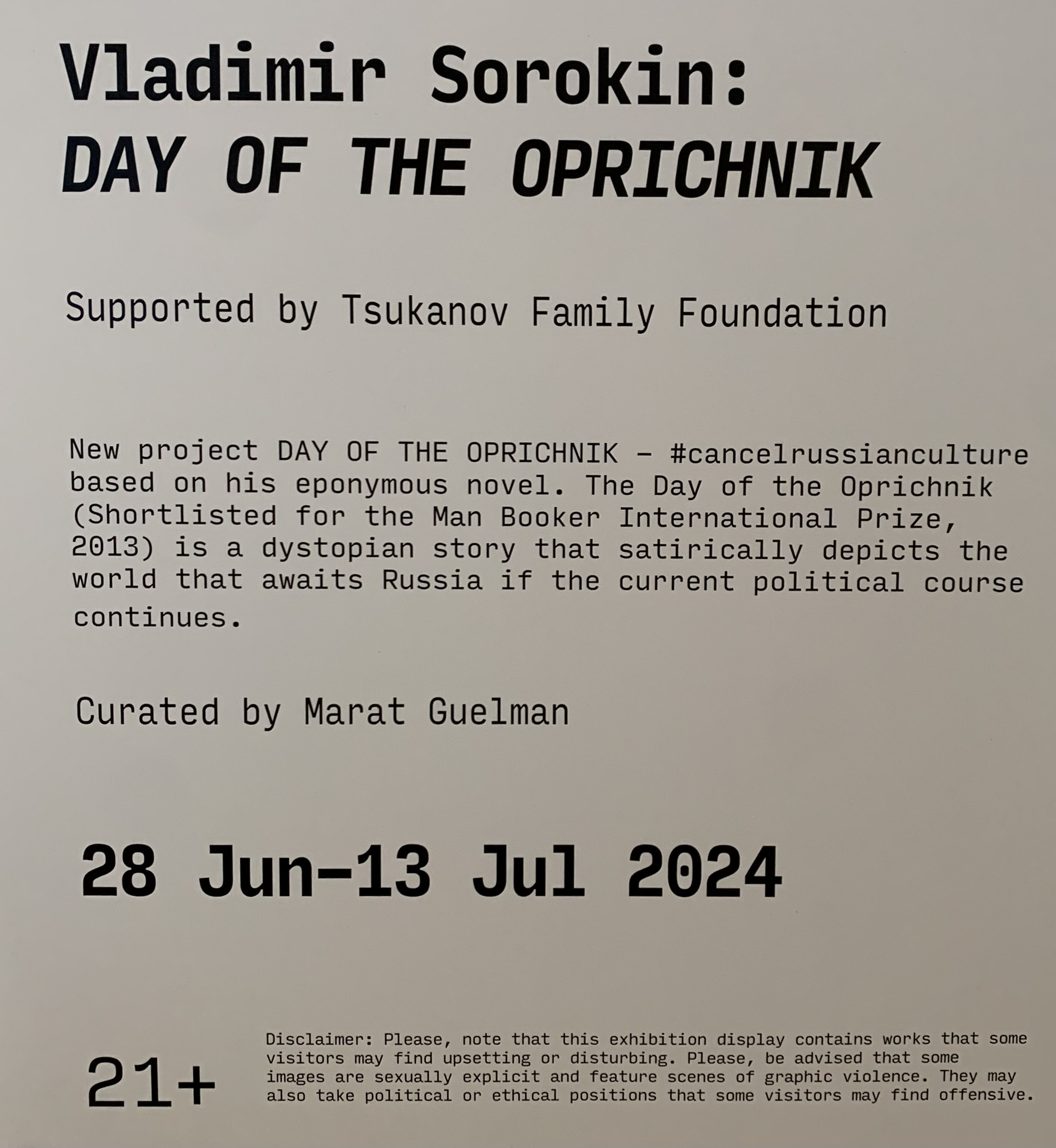 The question I asked myself during and after the exhibition was, would I go to a similar event if it wasn’t by Sorokin or some other already famous author or artist I admire? Unlikely, nay it depends. In the art history, more so in the most recent centuries, an artist’s name and the vision behind the work has often been meaning more than the work itself. I have a similar sentiment around “Day of the Oprichnik”.