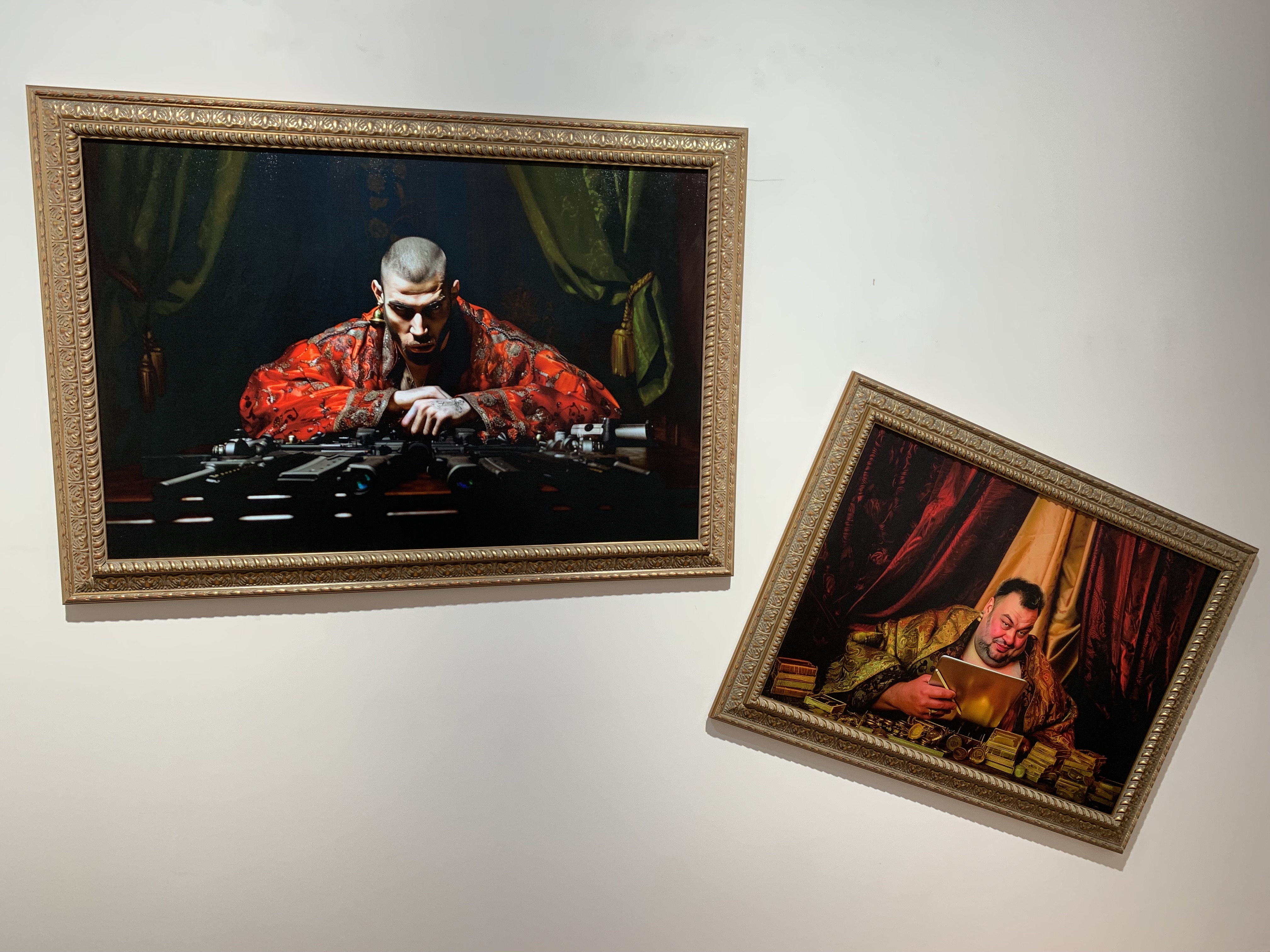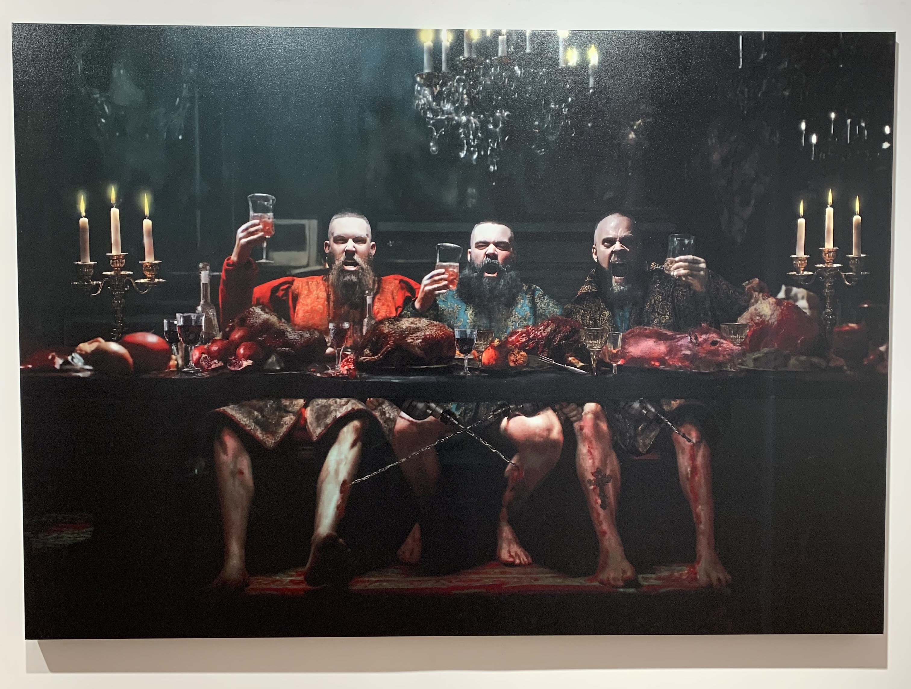 One of the AI-assisted exhibits, the oprichniki feasting after a successful raid on a nobleman. Diamond-tipped drills are used regularly as an ordeal to test the loyalty among the oprichniks.In the story, we follow the story of an ordinary day in his life of Andrei Danilovich Komyaga, one of the oprichniks. He lives surrounded by servants in a terem (wooden palace) confiscated from an enemy of the people. He travels to work on a lane reserved for oprichniks in a “merin” (Mercedes) with a broom and a dog’s head tied to the bumper (a symbol of the real oprichniks). At the beginning of the workday, he is to execute punishment on a nobleman. He and his crew kill the disgraced person, burn his house with flamethrowers, and rape his wife. After this, the oprichniks go behind the walls of the white-stone Kremlin (it was white before) for the absolution of sins at a service in the Assumption Cathedral. By the end of the day, Komyaga is to meet with a clairvoyant, the dissolute Sovereign’s wife, experience a drug trip, and participate in a gay orgy with his comrades in a bathhouse, strengthening the unity of the oprichnik corporation.