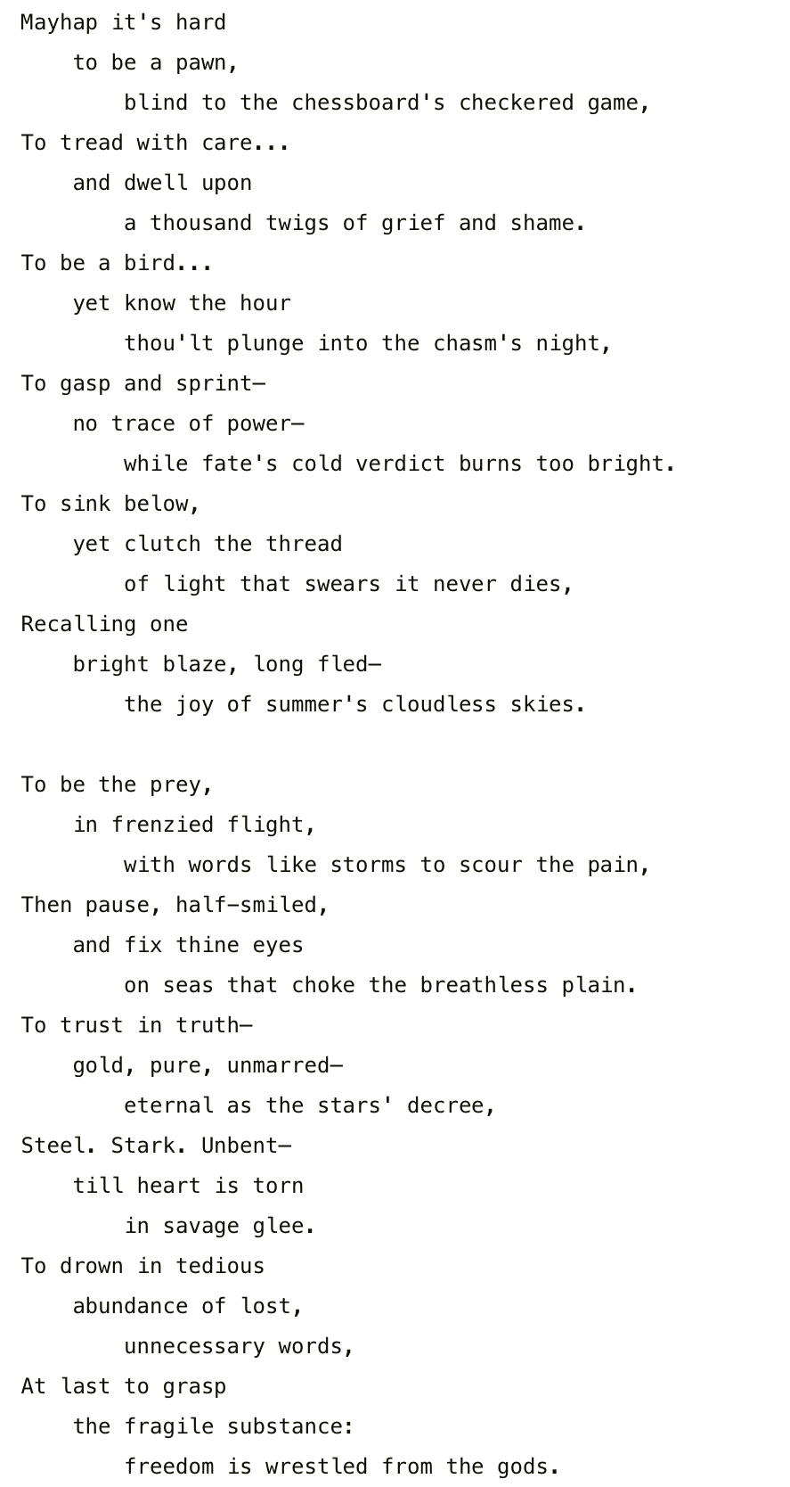 NO IDEA WHY BUT Substack refused to format it both as a poetry block and code block, EVEN just with paragraph breaks (bizarre; wtf?)§2 I used to play guitar a lot and even attempted to write music. I knew zero of music theory but could program drums and other instruments in Guitar Pro, a piece of software that allows you to program guitars, drums, and other instruments, professionally. It was a lot of fun and I want to do that again at one point, mayhap learning some proper music theory first. That is the second resolution for some mid-term future.