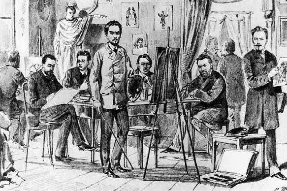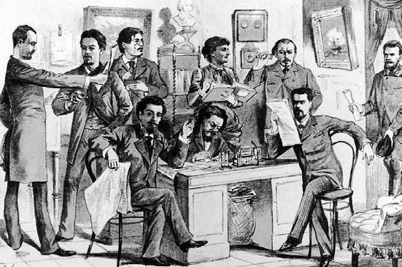 Artist’s workshop at The Wake-up Caller. Drawing from one of the issues printed in 1885. Nikolay Pavlovich Chekhov, Anton Pavlovich’s older brother, sitting in the centre. Nikolay Chekhov painted a portrait of his brother.